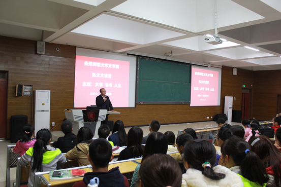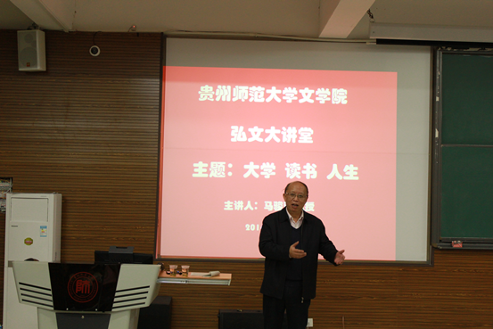 11月27日晚,享受国务院特殊津贴专家、省管专家、省政府参事室参事、中国世界古代史学会理事、省史学会副会长、我校历史与政治学院二级教授马骏骐应文学院邀请,做客“弘文大讲堂”畅谈“读书•大学•人生”。讲座由文学院党委副书记陈明主持。文学院各级辅导员及300余名来自各学院的学生到场聆听。