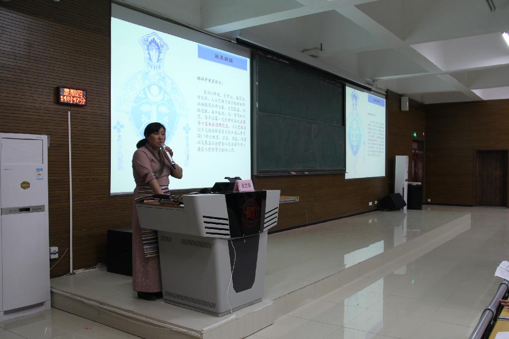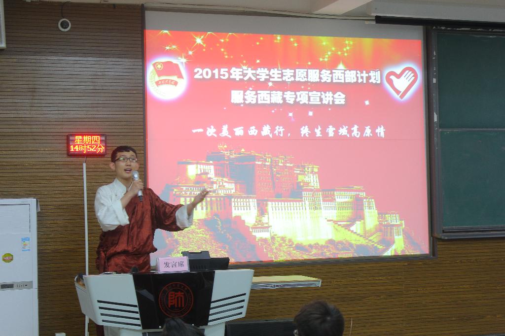 4月23日下午,2015年大学生志愿服务西部计划服务西藏专项宣讲会在我校公共教学楼6202教室举行。校团委志愿者工作指导老师饶蕾与现场两百余名参加宣讲会。