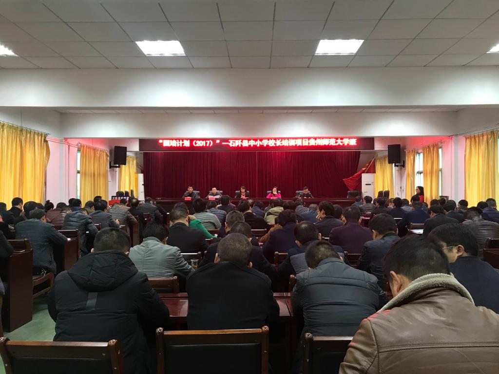 11月28至29日, “国培计划(2017)”——贵州师范大学送教到县(石阡县)中小学校长培训在石阡县教育局顺利举办。贵州师范大学国培项目办主任、教育科学学院党委书记杨建原,贵州师范大学国培项目办副主任、教育科学学院副院长穆陟晅,贵州师范大学附属中学校长王丽萍,贵州师范大学教育科学学院心理学副教授黄亚夫,北京师范大学贵阳附属小学校长、荔波教育局副局长赵国华,贵州省高级人民法院前法官陈玉斌赴石阡参与了此次培训活动。