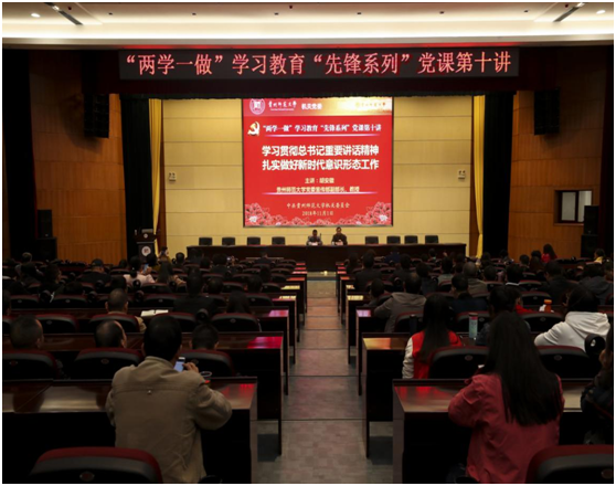 为认真学习贯彻习近平新时代中国特色社会主义思想和党的十九大精神,扎实推进“两学一做”学习教育常态化制度化,加强机关党员思想政治教育,机关党委于11月1日下午在花溪校区会议中心一楼报告厅举办了“两学一做”学习教育“先锋系列”党课第十讲。党课主题为“学习贯彻总书记重要讲话精神扎实做好新时代意识形态工作”,由学校宣传部副部长胡安徽主讲,机关党委书记夏江义主持。机关职能部门及教辅单位全体党员参加了党课学习。