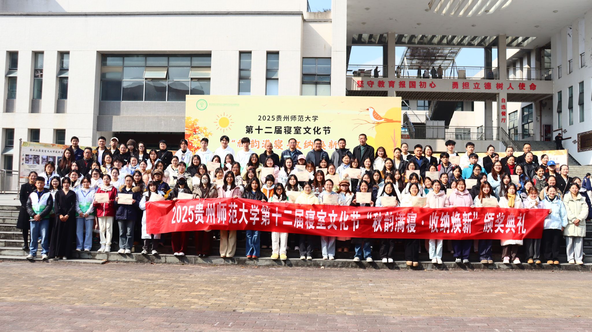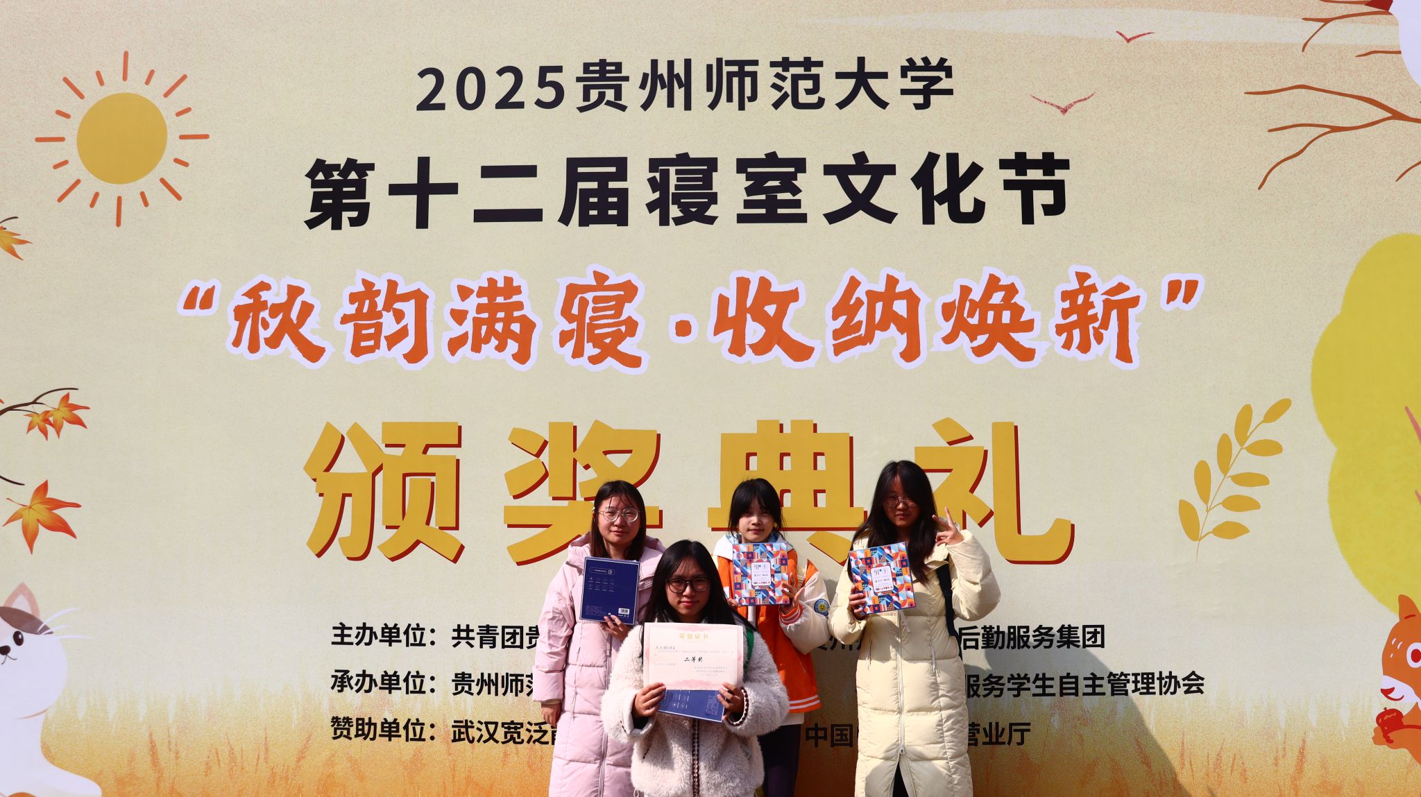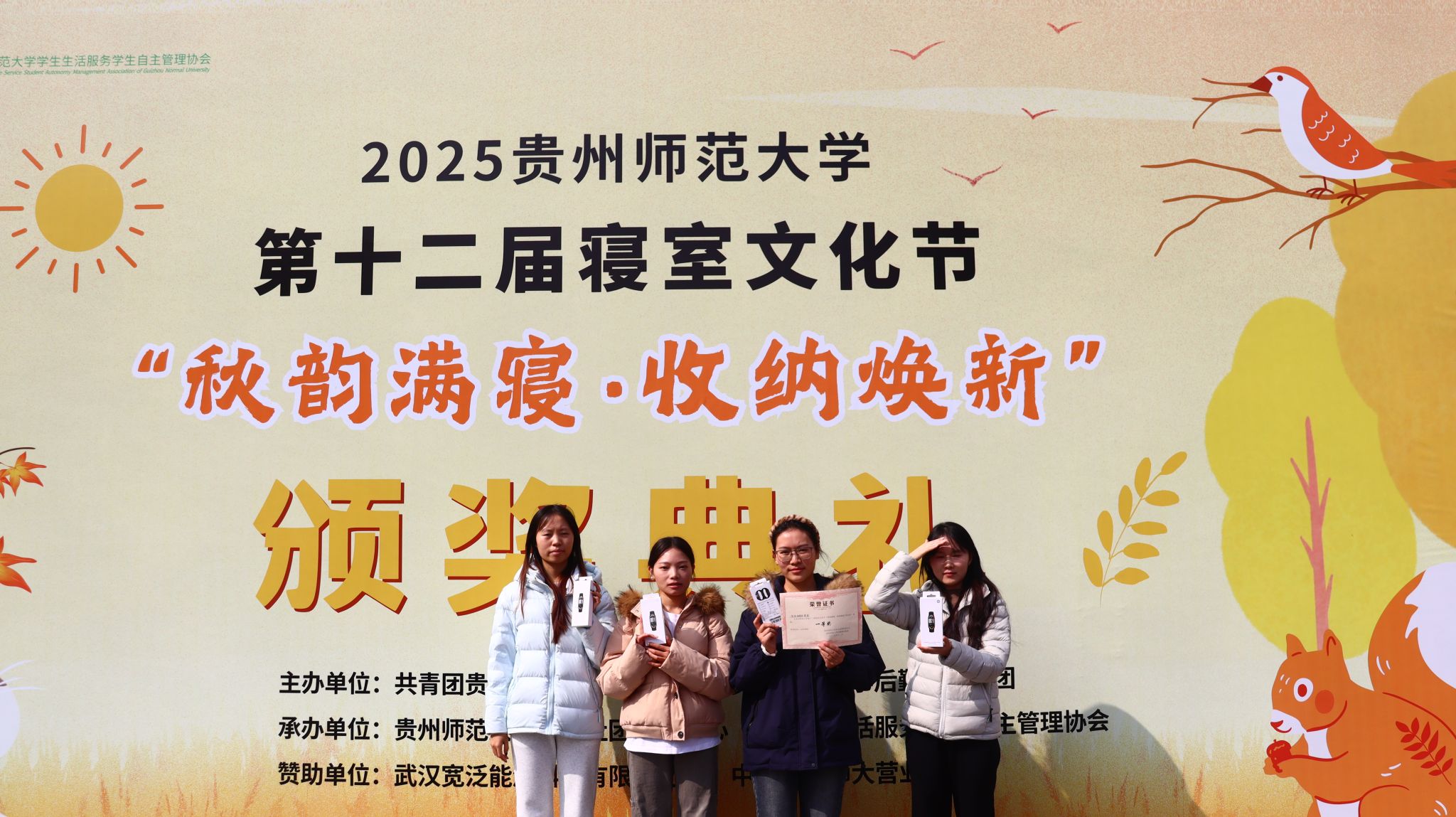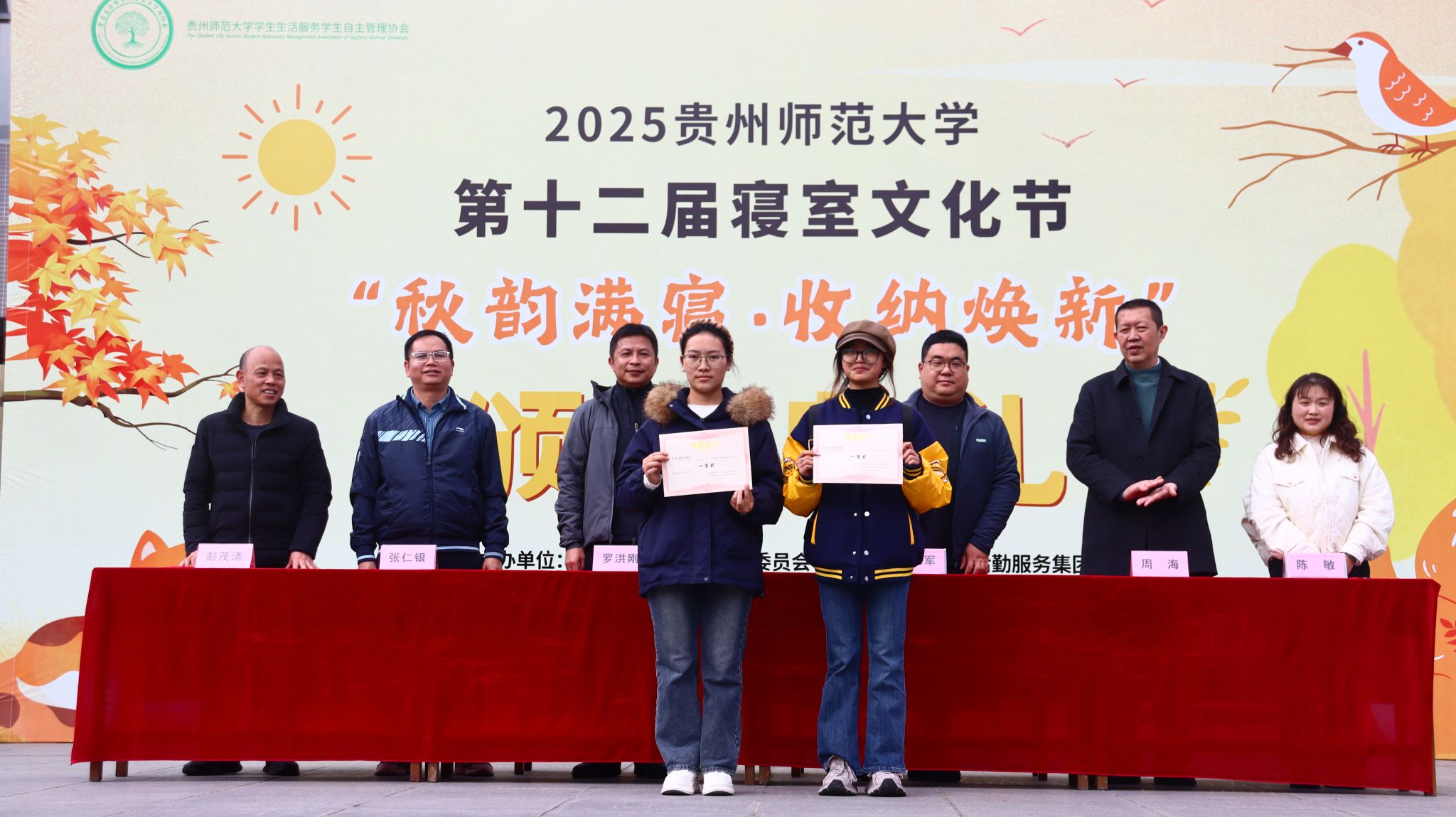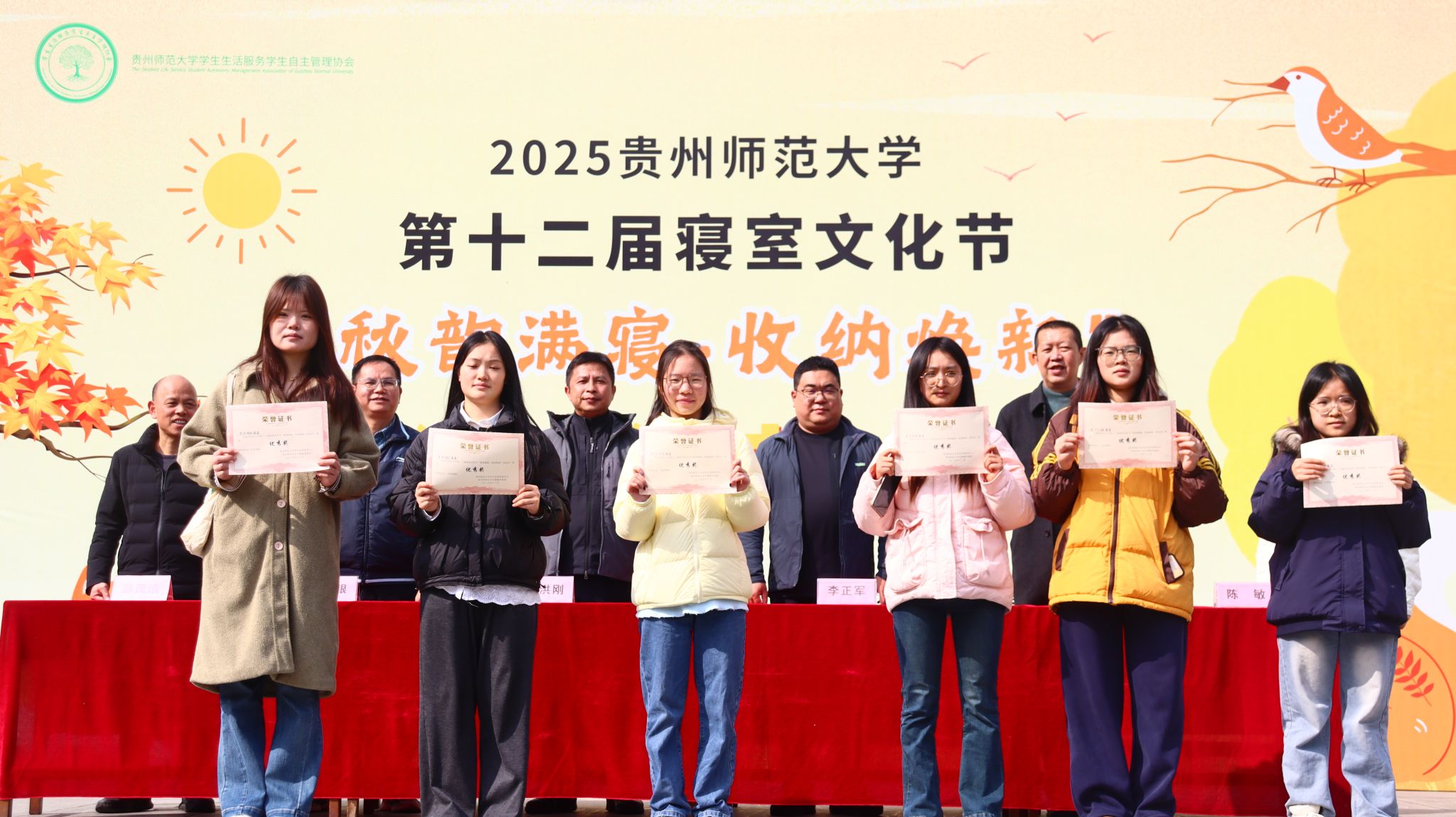 12月8日,贵州师范大学第十二届寝室文化节颁奖典礼在学校东区第一食堂门口举行。校团委书记李正军、后勤服务集团总经理罗洪刚等出席并为获奖学生颁奖。本次活动以“秋韵满寝·收纳焕新”为主题,由校团委与后勤服务集团联合主办,学生生活服务学生自主管理协会承办,旨在通过组织相关文化活动,丰富学生的寝室文化生活,提升学生收纳整理能力,营造整洁、温馨、有序的住宿环境,促进心理健康,激发创造力、厚植审美素养。