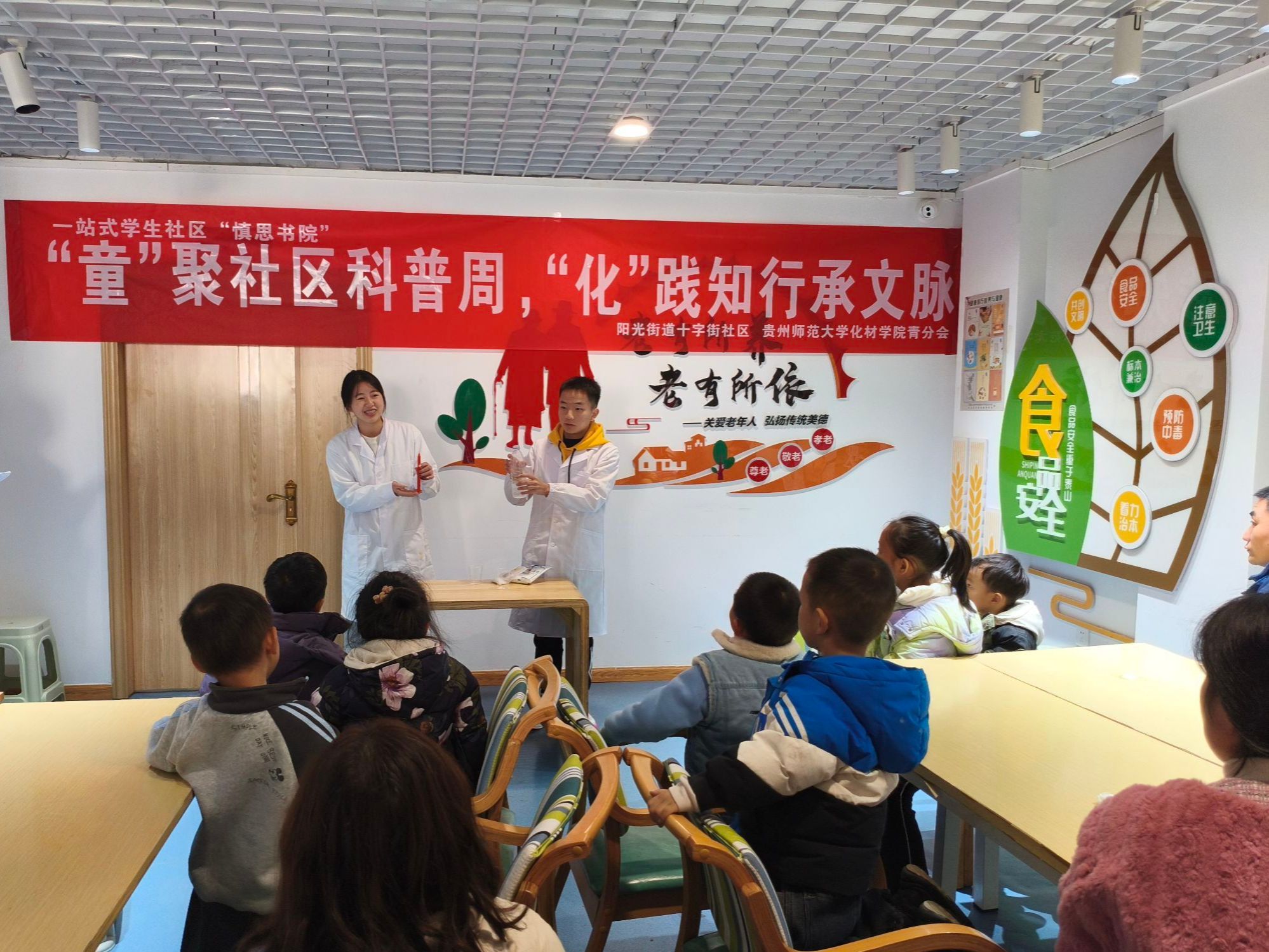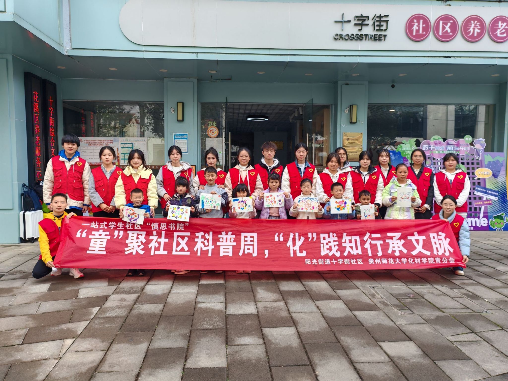 12月7日下午,化学与材料科学学院20名化学、科学教育、材料和应用化学专业本科学生,联合花溪十字街社区举办了以“‘童’聚社区科普周,‘化’践知行承文脉”为主题的大学生科普进社区活动,将趣味的化学实验与思政教育深度融合,为社区中小学生带去一场科学探索精神启蒙的生动体验,推动大中小思政一体化在社区落地生根。