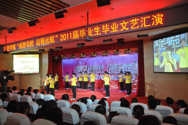 9点30分,2011届毕业生“感恩母校•启程远航”文艺演出开始了。大屏幕上播放起求是学院宣传中心为毕业生们精心制作的毕业纪念册——《铭刻》。记录短片把毕业生们从入学军训到学校运动会、艺术节,从寝室卧谈会到自修室学习等镜头剪辑在一起,让同学们再次回味大学生活这段难忘的成长经历,回味同学情,体会师生谊。