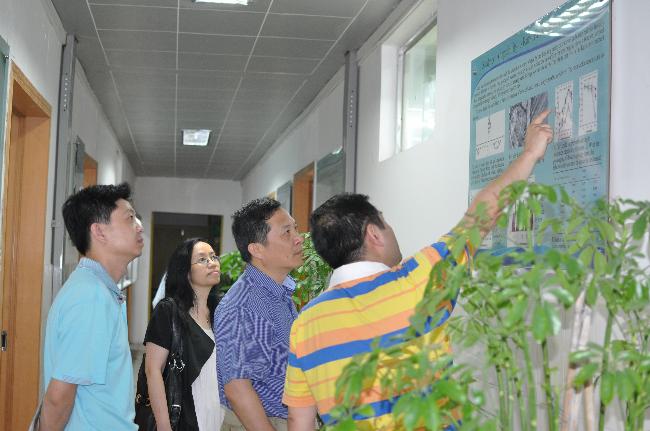 乙引院长(右一)向苏庆副厅长(右二)、熊庆博士(左一)、李明秀副处长(左二)介绍实验室建设情况