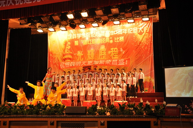 纪念建党90周年纪念大会结束后,由我院各党支部,各团支部,各班级精心排练准备的“唱红歌,诵经典”比赛正式开始,让现场一千多名嘉宾及观众在飞扬的歌声中、熟悉的旋律里共同回顾党的光辉历程,为党的九十华诞献礼。比赛分为“初创、发展、壮大、强盛”四个篇章,由09资环班的合唱《保卫黄河》拉开帷幕,强大的阵势、激昂的歌声一开始就让在场观众欣赏到一幕视觉盛宴;接着09地信班《十送红军》,醉意怏然,把我们带入了党与人民亲情一家的盛怀。接着由老师队伍为我们带来的诗歌朗诵《光辉历程》,集中讲述了党在初期发展、土地革命、抗日战争、解放战争、建国探索、改革开放等各个时期党对国家及民族的领导概要,阐明了党在社会主义发展时期的先进性;最终10级联合队的合唱《祝福祖国》表演独特,格局创新,得到了在场观众的整整掌声,赢得了98.2分的好成绩,获得了本次比赛的第一名。比赛在全场观众一曲《没有共产党就没有新中国》中落下了帷幕,意义旨在教育我们广大师生要始终不忘党的功绩,始终坚持党的领导,为加快推进社会主义现代化建设而奋斗。