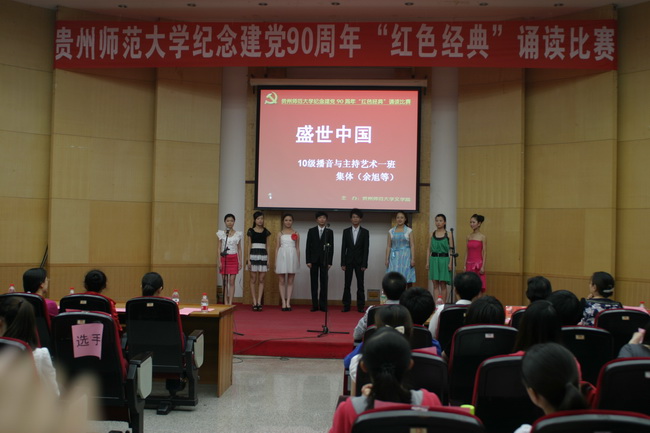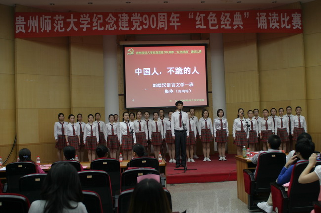 在主持人宣布比赛规则及评分标准后,一首《可爱的中国》拉开了大赛的序幕,在悠扬的背景音乐中,朗诵者饱含激情,让在场听众深切感受到祖国是可爱和伟大。2008级汉语言文学(1)班带来的《中国人,不跪的人》,震撼人心,赢得阵阵掌声。整场比赛,选手们用他们真挚的情感、饱满的热情以及富有艺术韵味的表现,诵出了一首首感人至深的红色经典。