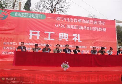 草海管理局副局长、草海镇党委书记马仲华主持开工典礼。威宁自治县委副书记、草海管理局党组书记于毅致辞。他说:贵师大的几名学子申报的“春晖家园计划”吕家河村G326国道至新华组道路修建项目的开工,促进了威宁自治县的春晖行动的重大转型,具有典型的示范作用。”他认为,该项目的开工为进一步鞭策广大青年牢固树立科学发展观,积极投身春晖行动实践,形成积极向上的社会良好氛围,加快推进我县经济社会发展具有重大意义。仪式上,贵州省春晖行动发展基金会副理事长、春晖杂志社执行主编蔡顺华以及威宁自治县党委副书记陈朝韵还分别为我校学子吕琦、吕庆称授资金捐助牌。贵州师范大学团委副书记陈贵平在贺词中说,吕琦等四名大学生的行为给贵州师范大学全体学生乃至全省大学生树立了良好的榜样,相信在他们的感召下,会有更多的大学生春晖使者积极投身到春晖行动中去,为家乡、为父老乡亲做实事、谋实惠。群众代表吕吉开在仪式上说:“今天是我们吕家河村全体村民最幸福的日子,作为村里的几名大学生,能够在外想办法帮助村里修路,解决我们出行难的问题,他我们非常感谢4位学子,也感谢学校对4位学子的培养。”