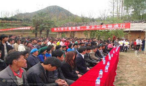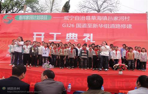 4月28日,威宁县草海镇吕家河村锣鼓喧天,鞭炮齐鸣,充满了节日的喜庆。当天,我校求是学院学子吕琦、吕庆称、陈蕊等同学共同申报的“春晖家园计划项目——威宁县草海镇吕家河村G326国道至新华组道路修建项目开工典礼隆重举行。共青团贵州省委副书记肖明龙、共青团毕节地委书记赵永富、威宁自治县委副书记、草海管理局党组书记于毅、共青团贵州师范大学委员会副书记陈贵平、春晖行动发展基金会副理事长、春晖杂志社执行主编蔡顺华、贵州师范大学求是学院党委副书记吴大军、威宁自治县交通运输局党委副书记陈朝韵等领导出席,吕家河村2000多人村民参加了开工典礼,典礼由草海管理局副局长、中共草海镇委书记马仲华主持。开工典礼上,吕家河村的青少年朋友自编自演了一台以《春晖颂》为主题的文艺节目。4名大学生的这种精神在全省都具有典型性,得到社会各界的高度赞扬和评价,也得到当地政府部门的高度重视,同时,该项目还喜得威宁自治县草海镇党委融资预计80多万元,目前项目预计共投资近100万元。