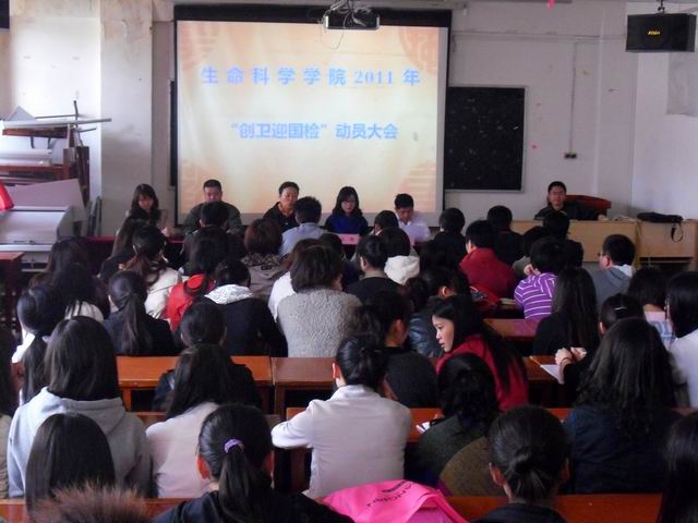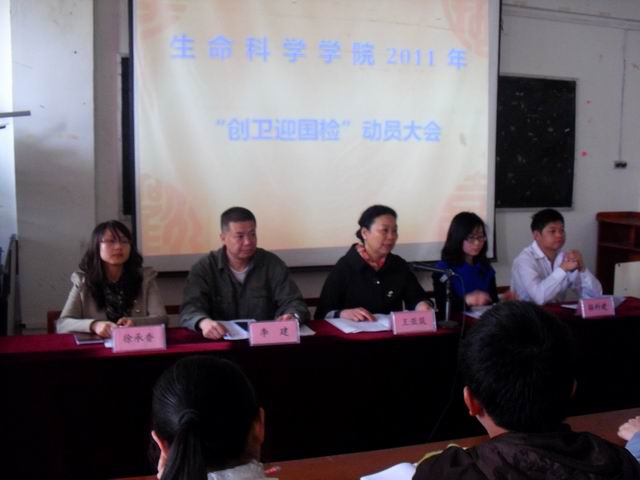 2011年4月21日下午五点,生命科学学院2011年“创卫迎国检”动员大会在学院703教室召开。出席本次大会的有:生命科学学院党委书记王亚筑、党委副书记李建、党委秘书骆科建、08级辅导员马骊、09级生科班辅导员徐承香以及学院各班学生代表。会议由马骊主持。