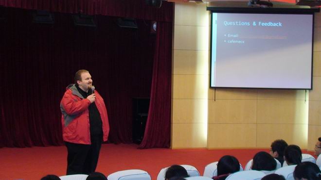 2011年3月16日下午4:30分,3月17日下午2:30分。来自美国OSU汉语旗舰工程中心Shaun分别在我校白云校区求是讲堂、宝山校区9407教室为我院旅游英语学生作了题为:《基于体验文化教学法的跨文化交流》讲座,我院师生300多人到场聆听。