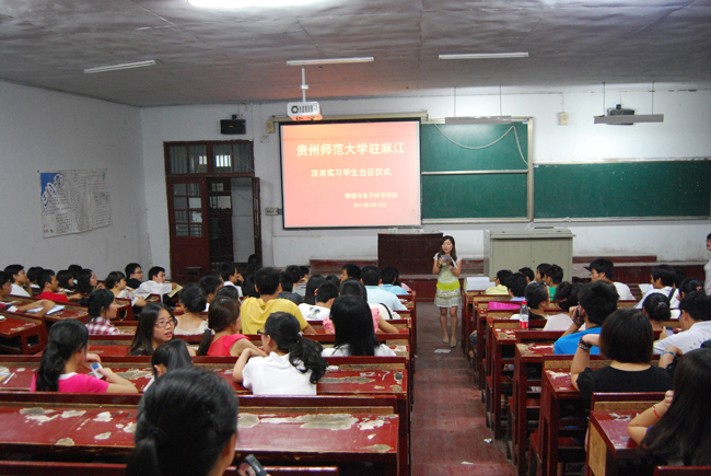 为了让学生有充分的顶岗实习准备,圆满完成顶岗任务,9月16日,物理与电子科学学院在物理楼733教室举行贵州师范大学驻麻江顶岗实习学生出征仪式。学院党委书记宇燕,院长陈世国,副书记李应发,副院长宋晓书出席了出征仪式。仪式由院团总支书记秦欣主持。学校赴麻江实习的9个专业共100多名同学参加了出征仪式。