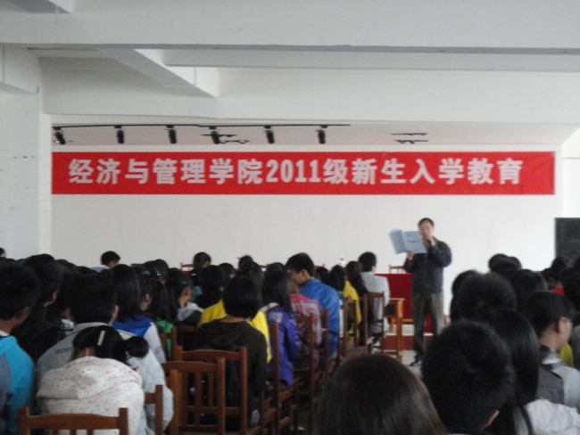 9月22日下午,经济与管理学院在白云校区学生活动中心举行2011级新生党团知识讲座,此讲座系学院新生入学教育内容之一。讲座由张晶晶老师主持,学院副处级组织员赵本喜、团总支书记高雅杰分别进行了党团知识介绍。