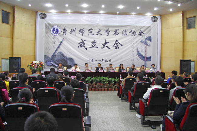 9月23日下午,我校书法协会恢复成立大会在田家炳教育书院三楼多功能厅隆重举行。副校长吕国富、校团委书记李娅出席成立大会。中国书协发展委员会委员、贵州省书法家协会副主席杨昌刚,贵阳市文联秘书长、贵阳市书法家协会副主席徐爽,中国书法家协会会员、贵阳市书法家协会副主席马宏明,贵州芙峰印社副社长龙秀强,贵州省书法家协会会员、贵州省青年书法家协会教育部部长杜洁,贵阳市书法家协会副秘书长沈庆梅和我校书法教师王世鹏、吴鹏、杨树森、冷光伟等应邀出席大会。出席大会的还有来自贵州大学、贵州民族学院等省内多所高校的书法协会会员代表、我校各校级学生组织代表以及书法协会会员代表。大会由校团委副书记陈贵平主持。