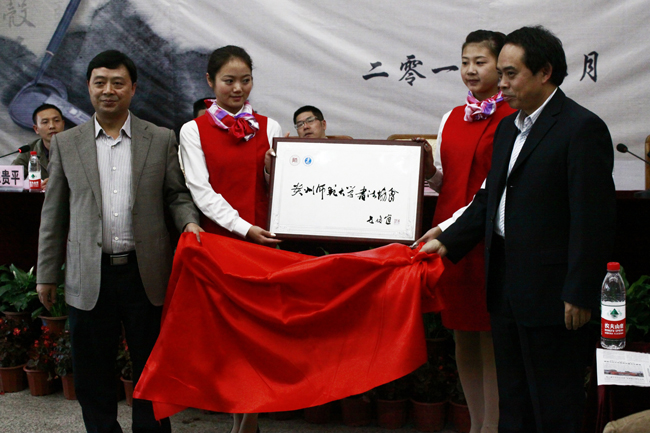 贵州省书法家协会副主席杨昌刚、贵阳市书法家协会副主席徐爽分别作了精彩的讲话,对我校书法协会的恢复成立表示高兴并表达了良好的祝愿。徐爽代表贵州省书法家协会主席包俊宜先生向我校书法协会赠送亲笔题词“贵州师范大学书法协会”书法作品。、