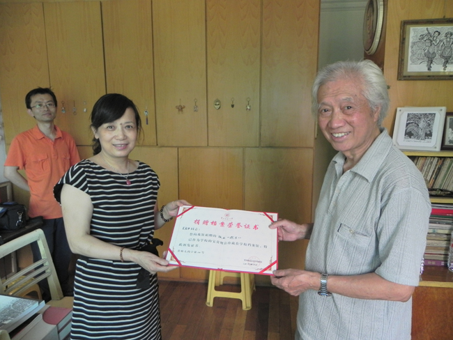 9月6日下午,我校艺术科1953届校友吴家华老师无偿向学校档案馆捐赠其版画作品《遐思》,并向学校赠送其个人著作《追索集》。吴家华老师从1956年开始从事版画创作,迄今已逾半个世纪,其善使圆刀,作品风格或细腻或粗狂奔放。《遐思》通过运用圆口刀刻就点、线,刀法细腻,是其版画作品的代表作。作为学校档案馆馆藏档案资源的重要组成部分,其捐献作品及著作将在档案馆永久保存。此外,吴家华老师还回忆了上世纪50年代学校艺术科的一些情况。