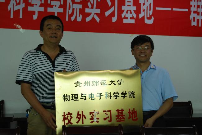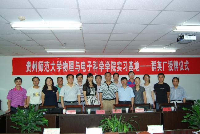 7月11日上午,物理与电子科学学院与中国振华集团群英无线电器材厂(以下简称群英厂)在该厂会议室举行实习基地授牌仪式。参加此次授牌仪式的有群英厂党委书记马晋川、副书记龙小珊、总工程师赵瑞平及部分部门负责人、物理与电子科学学院副院长陈世国、党委副书记李应发、副院长宋晓书、实验室主任王麒、电信学科主任刘万松、宋泽运博士。授牌仪式由群英厂人力资源处处长郭颖主持。