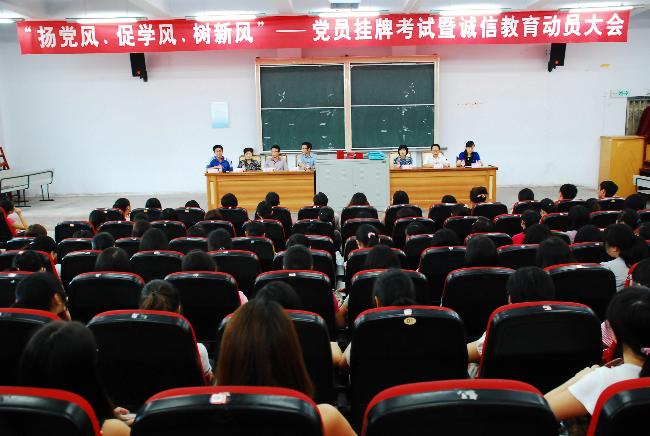 在迎接中国共产党成立90周年,“五先进一满意”创先争优活动纵深推进之际,2011年6月17日下午,外国语学院在田家炳教育书院五楼阶梯教室召开了2008级、2009级全体学生参加的“扬党风、促学风、树新风”——党员挂牌考试暨诚信教育动员大会。学院党委书记马玉平、院长刘瑾、副书记吕涛、副院长嵇德全、副院长郑志进、学院党委原副书记任运奇以及相关年级辅导员出席大会,会议由学院党委委员何小明同志主持。