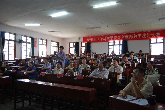 为进一步提高我院青年教师的教学水平,培养优秀青年教师,6月24日下午,我院在物理楼733教室举行首届青年教师教学技能大赛。副院长宋晓书致开幕辞。此次大赛共有17名来自物理学和电子信息科学与技术专业的青年教师参加。我院党政领导、学科主任及教授共11人担当评委。大赛特邀学校教学督导莫周文教授担任评委组长。
