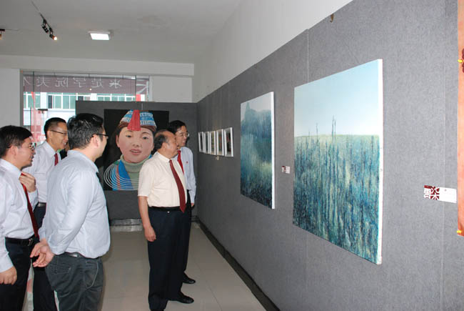 校党委书记蒲芝权(中)观看我院美术系毕业画展