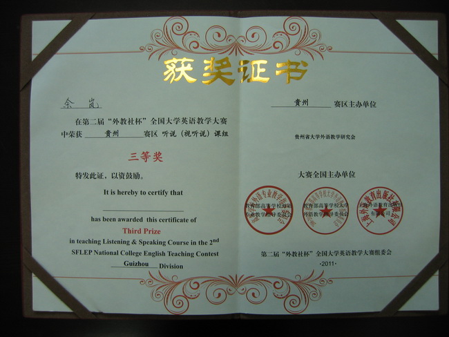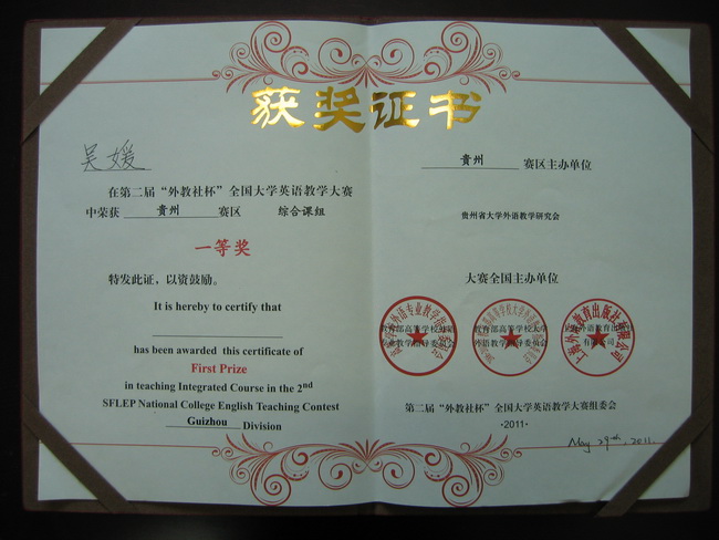 第二届“外教社杯”全国大学英语教学大赛贵州赛区决赛于5月28、29日在贵州大学举行,我校派出经大学外语教学部4月29日进行的贵州师大选拔赛中获综合组和听说组一等奖吴媛、余岚两位青年教师,代表我校参加了在贵州大学举行的“贵州省大学英语教学大赛”。此次赛事有来自全省各地区近40名选手参加,经过紧张激烈的角逐,我校吴媛老师获综合组一等奖,余岚老师获听说课组三等奖。