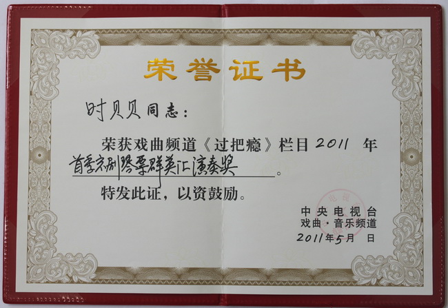 近日,音乐学院凌鸽老师指导的学生时贝贝荣获中央电视台戏曲音乐频道《过把瘾》栏目2011年首季京剧琴票群英汇演奏奖。