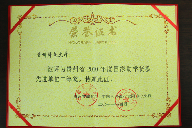 从4月26日召开的贵州省2011年学生资助工作会议上获悉,由于2010年度国家助学贷款工作完成出色,我校被贵州省教育厅、中国人民银行贵阳中心支行联合评为贵州省2010年度国家助学贷款先进单位二等奖。