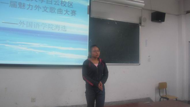 为积极响应校团委“一周一主题,一院一特色”的活动号召,外国语学院于2011年4月20日晚在综合楼203教室举行了院内的歌曲大赛海选。