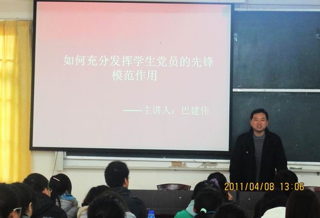 启动仪式上,项君带领全体学生预备党员宣读了入党誓词,随后,巴建伟为同学们做了主题为“如何充分发挥学生党员的先锋模范作用”的第一场专题讲座。他结合自身体验,从入党的动机、入党后如何进行理论学习、怎样善于捕捉信息、以何种形式将所思所学付诸实践行动等方面深入浅出、风趣幽默地为同学们做了深刻解读,并要求学生骨干应提高个人修养,增强团结意识、分清责任权利与利益之间的关系、以实际行动在同学中起到带头表率作用。