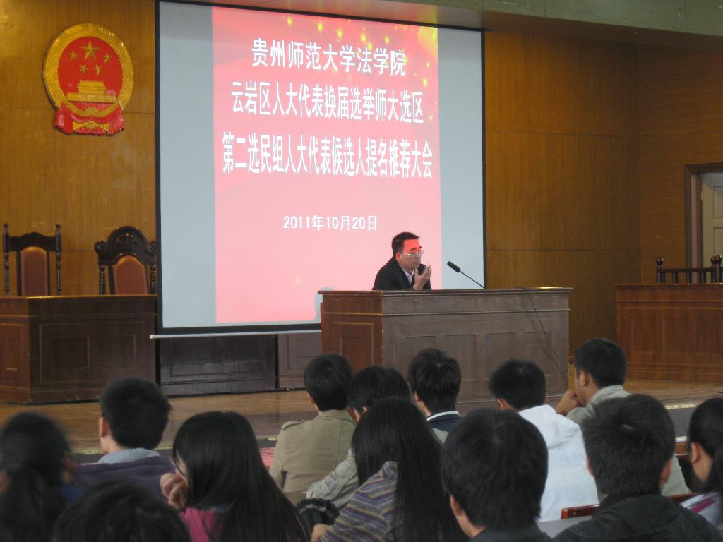 10月20日,我校法学院在美术大楼13-1举行云岩区人大代表换届选举师大选区第二选民组人大代表候选人提名推荐大会。法学院党委书记蒙黎明、院团委书记欧秀松、辅导员张盈盈出席会议。学院具有选举资格的同学参加了大会。