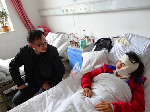下午4时许,吴大军副书记一行到达都匀市414医院,见到躺在病床上的刘莎莎的头部、脖子缠满纱布,行动不便,吴大军亲切地走上前去,轻轻地坐在病床旁,详细询问了刘莎莎的受伤情况。当吴大军向刘莎莎转达了学院领导的关怀、全院师生的关心,并送上慰问品和1000元慰问金时,刘莎莎同学激动万分,表示非常感谢学院领导和老师对她的关心,会安心养伤,争取早日康复,尽早回到学校。吴大军叮嘱刘莎莎安心养伤,遇到困难及时向学院领导、老师反映,学院会尽最大努力予以解决。刘莎莎的家属向学院领导不辞劳苦,看望慰问受伤学子的深切关怀表示感谢。