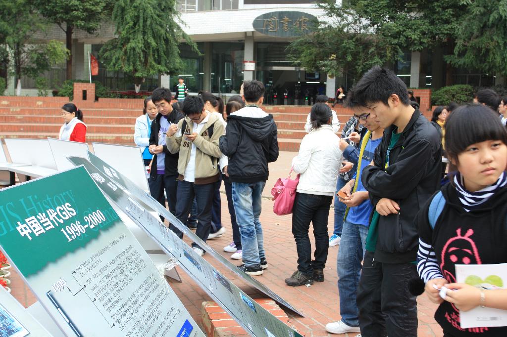 中午,由贵州省山地环境重点实验室、地环学院GIS学科组、学院团委学生会、学院2009级GIS班联合主办的“GIS科普展”在学校晨钟广场举行。学院党委书记杨建红、院长安裕伦、副院长殷红梅参观了整个展出。展出包括“贵州省GIS发展概要”、“贵州省GIS成果展”、“地环学院GIS学科建设概要”、“地环学院师生GIS成果展”等四个方面的内容。展出还包括了GIS相关知识讲解,分发GIS和ESRI宣传单,举行“我的GIS”抽奖仪式等内容,受到了广大师生的喜爱。