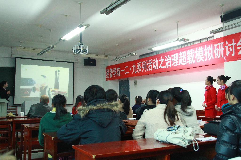 经济与管理学院“一二·九”系列活动之治理超载模拟研讨会于12月14日上午10:00在文科楼5-2室顺利开展。学院党委书记巴建伟,副院长王立伟,龙前朋老师、周雪老师、杨馥榕老师、 贺洁老师、团总支书记高雅杰、辅导员江剑虹作为评委和嘉宾出席了此次活动,此次活动由学院2009级电子商务团支部承办。研讨会特别邀请到贵州电视台实习记者来到现场为研讨会做全程录像。