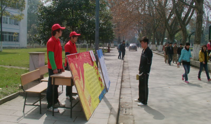 中午,学院青年志愿者分成两个小分队行动。一小分队将学院青分会宣传部制作的以“学习雷锋精神”为主题的展板搬至学校林荫大道旁,向广大同学宣传雷锋精神。