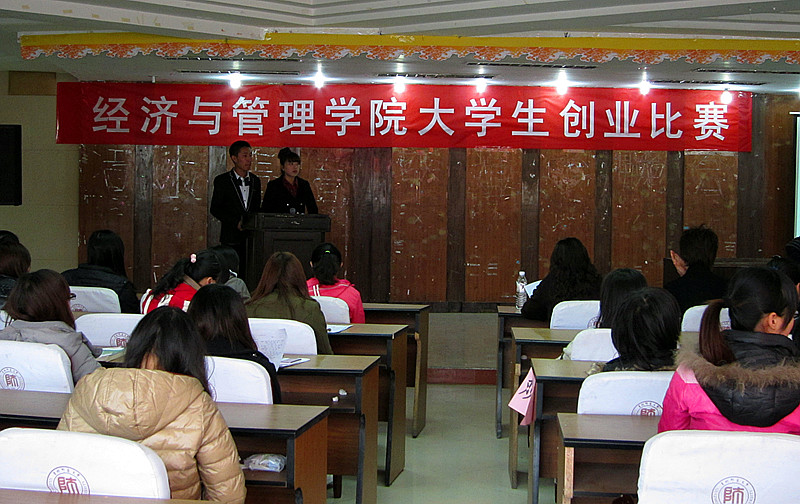 3月23日下午,我校经济与管理学院第一届大学生创业计划大赛在白云校区综合楼211教室举行。学院院长吕萍,院党委书记巴建伟,副院长韦艳、王立伟,院党委副书记项君,工商管理系主任汪娇柳、管理科学与工程系主任思丽妮等7位老师担任评委。本次比赛在提交文本作品的前提下,共15支团队参赛,比赛分为团队现场陈述和评委提问两个环节。参赛的创业项目涉及到餐饮、服务、制造等多个方面,各有特色。现场陈述时,参赛团队的选手们都做了精心准备,运用情景展现、PPT演示等多种手段,凸显各自创业项目的特点,充分展示出当代大学生锐意拼搏、求实上进的时代风采。