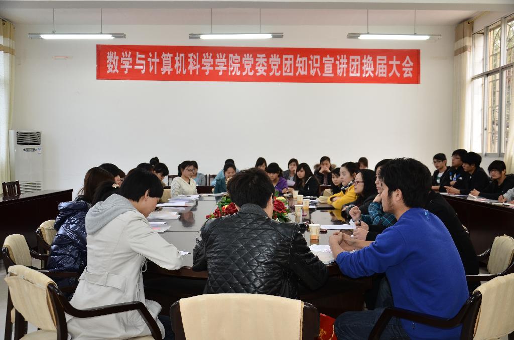 3月26日下午,数学与计算机科学学院党团宣讲团第六届换届大会在数计学院会议室举行。学院党委书记戴雪梅,副处级组织员杜梅英,院团委书记苗庆,辅导员邓莉莎、吕重犁出席会议。宣讲团第五届主要成员和第六届全体成员参加会议。会议由苗庆主持。