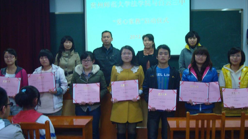 3月30日下午,我校法学院与白云三中第二期“爱心家教,法律帮扶”启动仪式暨表彰仪式在白云三中多媒体会议室举行。白云三中何代乾校长、思教处周平老师,法学院10级、11级辅导员陈荣霞、徐宁以及法学院青分会全体成员、全体爱心教员和受辅的学生参加了仪式。