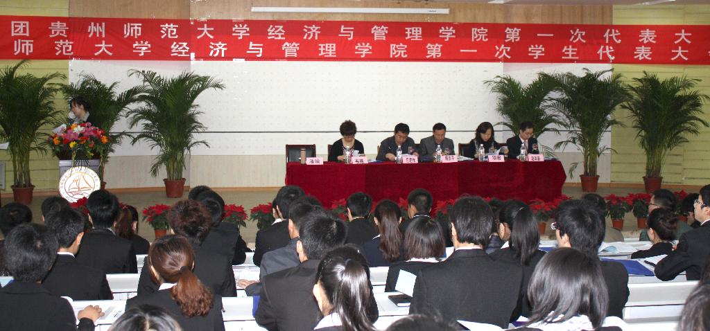 上午10点,“共青团贵州师范大学经济与管理学院第一次代表大会、经管学院第一次学生代表大会”正式会议在白云校区求是报告厅召开,校团委副书记陈贵平、学院党委书记巴建伟、副书记项君、副院长韦艳、副处级组织员赵本喜、院党委秘书潘瑜及各年级辅导员老师和嘉宾出席了此次会议,“两代会”全体代表、列席代表共134人参加了会议。会议由潘瑜主持。