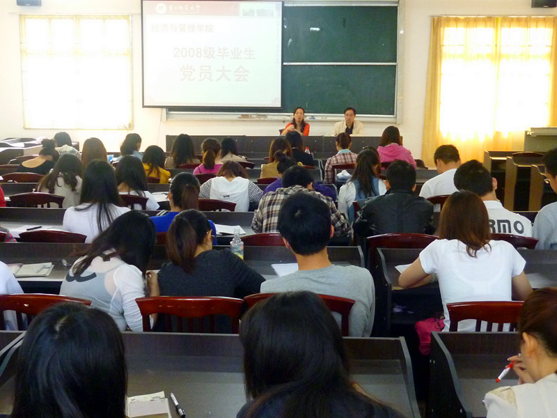 4月26日,经济与管理学院在学院531教室举行了2012届毕业生党员大会暨毕业生文明离校承诺仪式。学院党委副书记项君,组织员赵本喜出席会议。