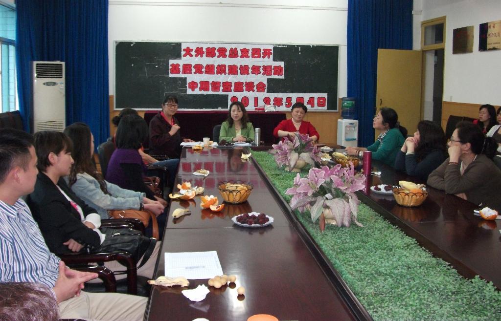 5月4日下午,我校大学外语教学部全体教职工党员、研究生党支部书记及党员代表在大外部会议室召开基层党组织建设年活动中期督查座谈会。会议由党总支书记邓晓蒨主持。会议邀请校基层党组织建设年活动指导督查组成员闫慧芝督导参加。