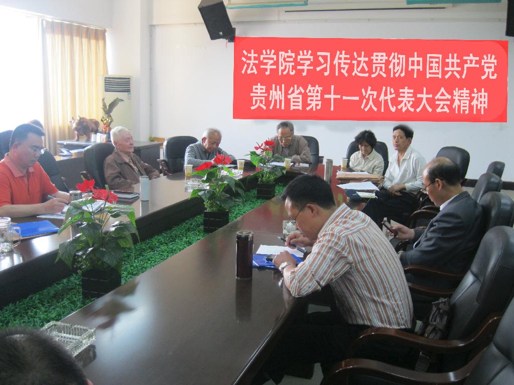 4月27日,法学院党委召开会议,学习传达贯彻中国共产党贵州省第十一次代表大会会议精神。会议由法学院党委书记蒙黎明主持。学院党委副书记林也婷,副院长李运才、文永辉,党委委员毛永俊,各教工党支部书记及全体教职工党员参加会议。