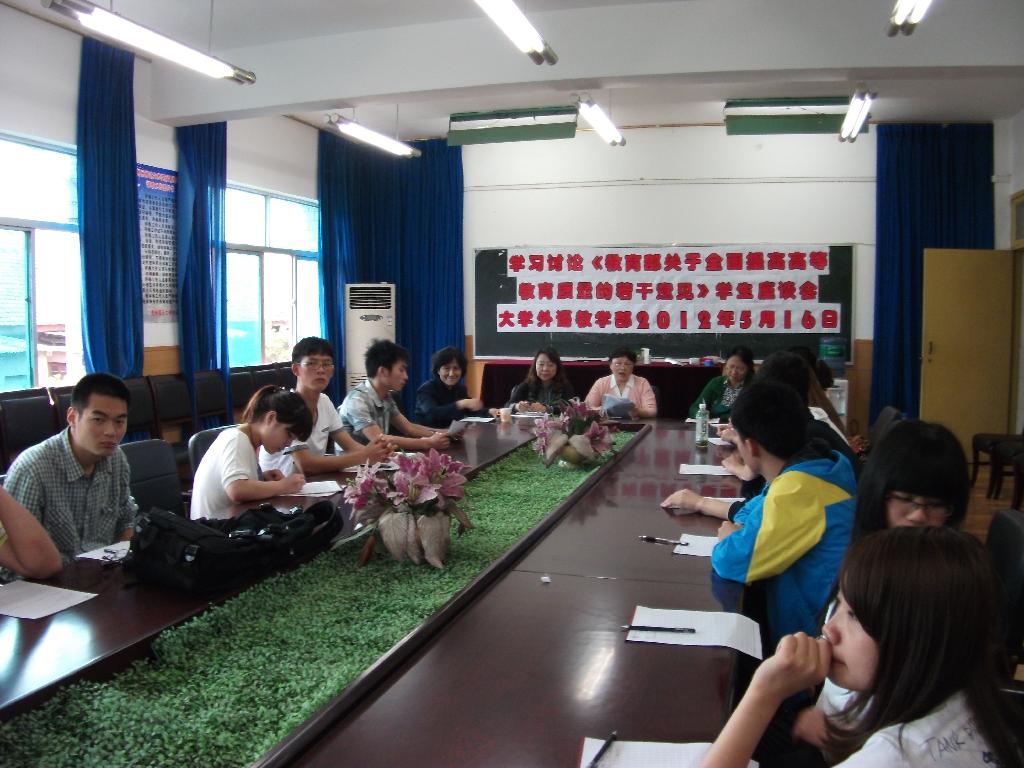 为深入贯彻落实《教育部关于全面提高高等教育质量的若干意见》和《教育部财政部关于实施高等学校创新能力提升计划的意见》文件精神,5月16日下午,大学外语教学部在部会议室召开学生代表座谈会。座谈会邀请校督导孙芳琴、梁梅两位老师出席,大外部党政负责人参加。