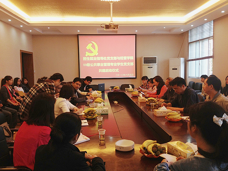 为贯彻落实《中共贵州师范大学委员会关于在创先争优活动中开展基层组织建设年活动的实施方案》的文件要求,充分发挥“三联三建三带”工作机制,实现合作共建、相互促进、良性发展的目标,6月5日上午,我校招生就业指导处党支部与经济与管理学院2009级公共事业管理专业学生党支部共建启动仪式在经济与管理学院会议室举行。学校“党的基层组织建设年活动”督察组督导员陈昌华老师,经济与管理学院党委书记巴建伟、党委副书记项君、副处级组织员赵本喜,招生就业指导处副处长程虹及两个党支部全体教师党员和学生党员参加了仪式。仪式由项君主持。
