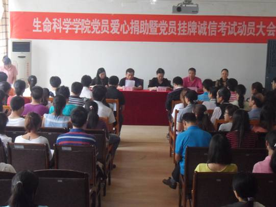 6月20日下午,生命科学学院在学院三楼大会议室召开党员爱心捐助暨党员挂牌诚信考试动员大会。生命科学学院党委书记王亚筑、院长乙引、党委副书记李建、副院长翁庆北、党委组织员葛皓出席会议,各党支部书记及党员代表参加会议。会议由李建主持。
