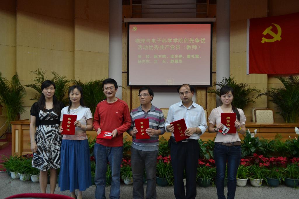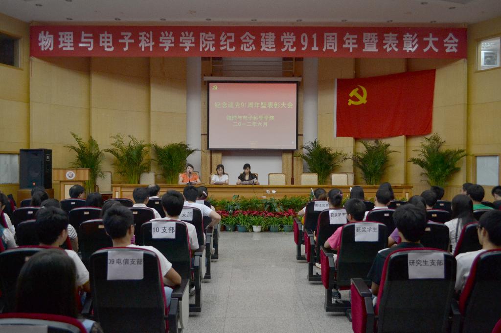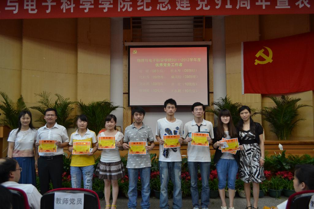 为隆重纪念中国共产党成立91周年,回顾党的光辉历程,颂扬党的丰功伟绩,进一步统一思想、坚定信念,明确目标、振奋精神,鼓足干劲、创先争优,扎实抓好基层党组织建设年活动,努力提高党员的综合素质,充分发挥党员、党支部在党员发展、创先争优和班风、学风建设等各项工作中的积极作用,6月21日下午,物理与电子科学学院在田家炳书院三楼多功能厅举行纪念建党91周年暨表彰大会。会议表彰了庞礼军等7位“优秀教师党员”、2011-2012年度“先进学生党支部”、“优秀双学班级”、代丽芳等13为“优秀学生党员”、戴茂松等8位“优秀学生党务工作者”、3栋518等10间“党员文明寝室”。学院党政领导、各教工党支部书记、学生党支部书记。全体党员共计150余人出席。会议由院党委秘书帅永平主持。