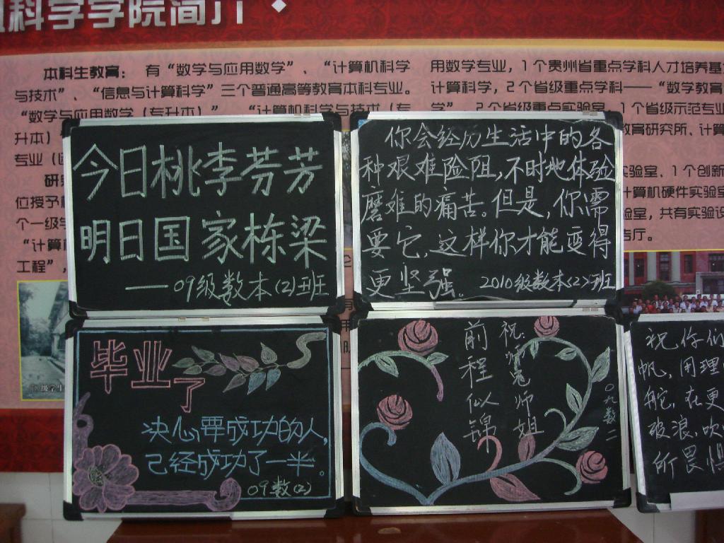 在学院团委的组织下,09、10级同学纷纷在赠言展板上为毕业生留下诚挚的祝福,同时,学院还展出了各班级以毕业祝福为主题的小黑板作品。“祝师哥师姐前程似锦”、“愿你的明天充满希望”、“今天的分别是为了明天更美的相聚”等真切话语道出了学弟学妹的美好祝愿,使毕业生备受感动和鼓舞。