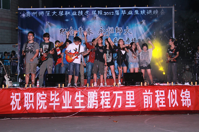 欢送晚会现场气氛热烈,高潮迭起,舞台周围人山人海,虚无坐席。由贵州大学、贵州民族大学以及我校当前最优秀的摇滚音乐爱好者组成的三支乐队,满怀激情地为我校师生演绎了多首经典曲目。一曲《我可以抱你吗》,表达出职院毕业生对母校深深的惜别之情;一首《海阔天空》抒发了职院学子对未来生活的积极追求,敢于向命运挑战的决心。《红蜻蜓》、《童年》、《永远别说再见》、《难道》让大家思绪万千、感概无限。美丽的夜晚,动人的歌声,一声声祝福的话语,一句句难舍的安慰,深深打动了在场每一位师生的内心。