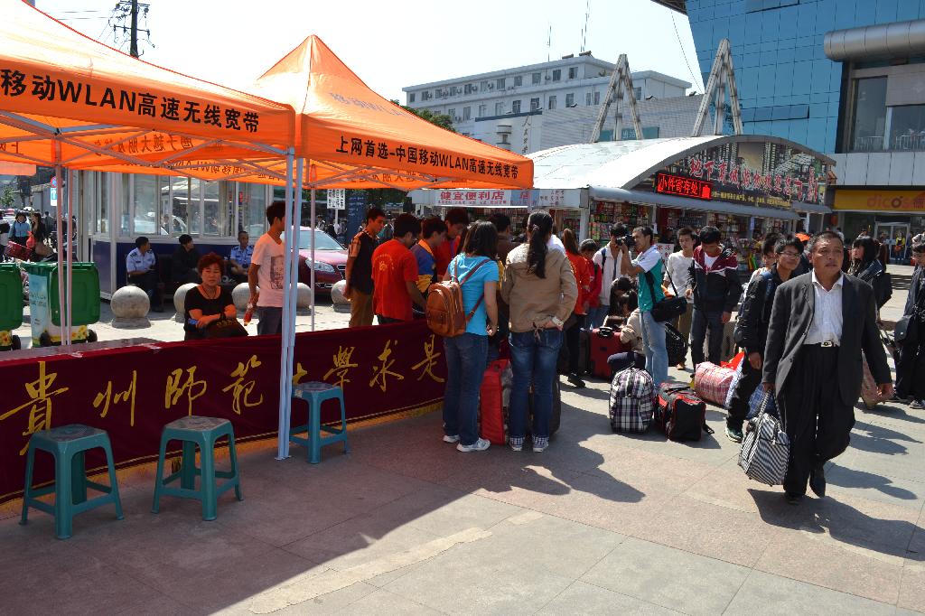 在贵阳火车站和金阳客车站,学院副处级组织员田茂超、帅永平老师热情地迎接远道而来的新生及家长,志愿者们主动帮助新生们提行李、找座位,用微笑和真诚为他们送上温暖。学院门口、求是广场、校园主干道、学生宿舍等地随处可见志愿者,他们用真诚的微笑耐心地接待每一位新入学的学生及家长,详细地向家长解释入学需要办理的各项手续,并为家长和新生提供饮水和座椅等服务。