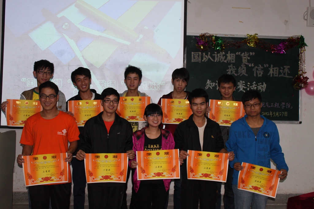 为了进一步做好国家助学贷款工作,增强大学生诚信还款意识和社会责任感,9月27日晚,机械与电气工程学院在白云校区综合楼505教室举办了“国以诚相‘贷’,我需‘信’相还”知识竞赛活动,旨在加强当代大学生的诚信教育,培育大学生的诚信品格。学院李梅老师;学生会主席闫强,副主席颜文强、吴建文;团委副书记雷嘉明莅临现场指导比赛。活动由学院学生会各部门组织安排,吴文浩、蔡瑶两位同学主持竞赛活动。