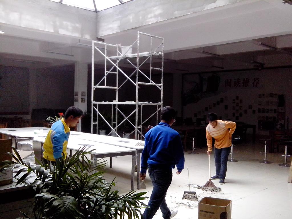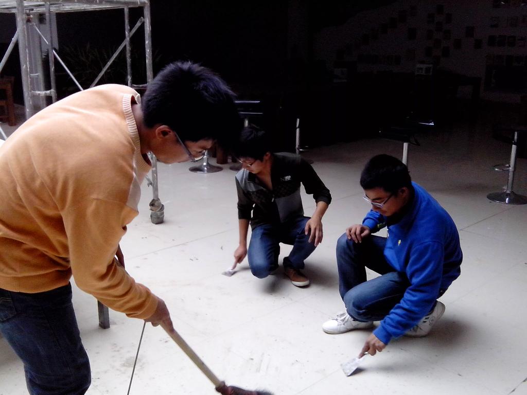 10月8日,新生上课第一天,图书馆内环境卫生未清理完毕不能如期投入使用,为尽快使得图书馆面向广大同学开放,在学院李建副书记的组织与指导下,20余名学生再次进入图书馆帮助工作人员进行清洁工作,同学们用力地铲除地上已凝固的水泥,认真清理地面的垃圾和污迹。