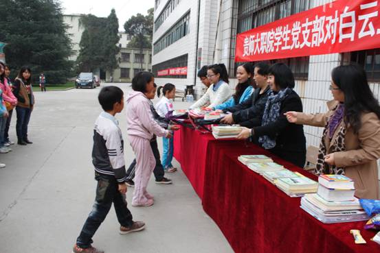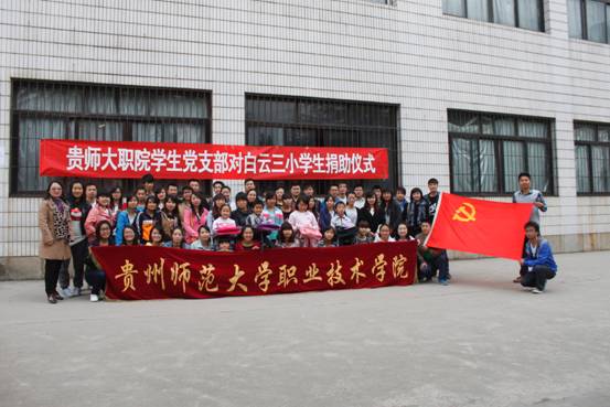 11月3日,职业技术学院学生党支部在白云校区第二教学楼前开展了对白云三小贫困学生的帮扶捐助活动。学院党总支副书记印明富、党总支秘书李华、计算机系管理系学生联合党支部书记李红梅、机电系学生党支部书记柳青出席此次活动。
